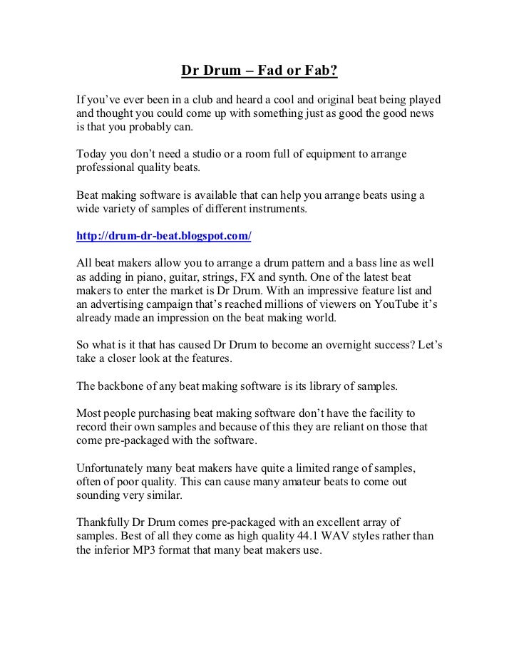 Download Now! ► ◄ Free Download Dr Drum Full Version - The Best Beat Maker Software! [Dr Drum Beat Making Software For Free] The 12 pad drum equipment makes it easy to create great drum defeats, together with drag and also drop support with regard to importing your own seems! The particular sounds in which you desire these people, learn abilities that studio technical engineers use each day. A lot sooner as compared to it took these!